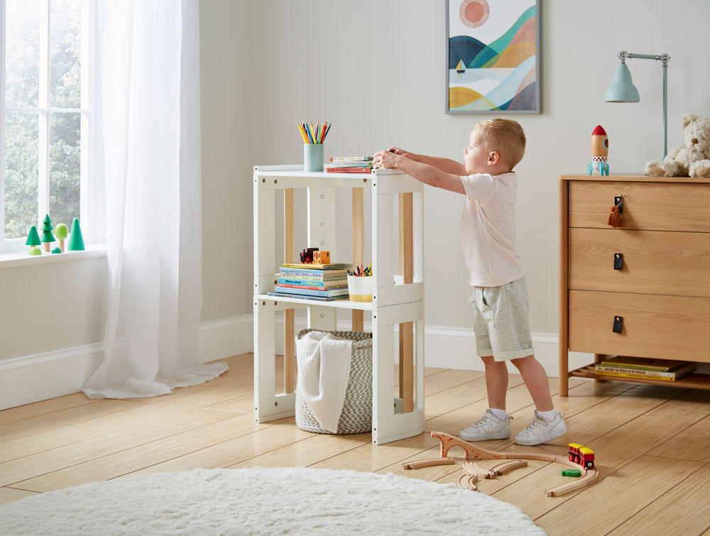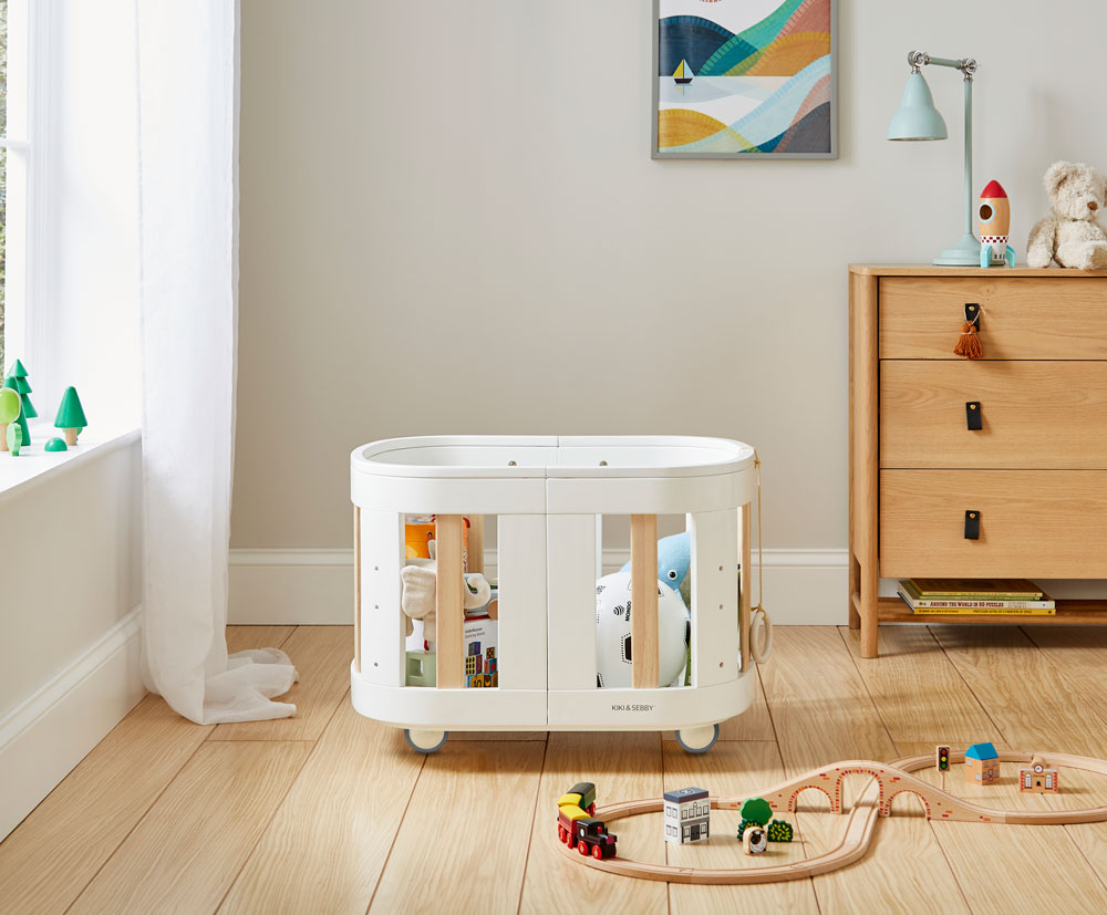 With lockable, swivel wheels, the SBROUT® 4-in-1 Crib is easily moved from room to room and once the baby has outgrown the cot, the additional pull-along handle and small wheels turn it into a pull-along toy cart. When the toddler has moved into their bed, the SBROUT® is easily adjusted into a super cute table and chair, ideal for the little ones to get crafting and creative or their little dining table next to the adults. Following on, the SBROUT® 4-in-1 Crib is easily transformed into a handy shelving system for your child’s bedroom and then into a chair with additional cushions suitable until late childhood.
