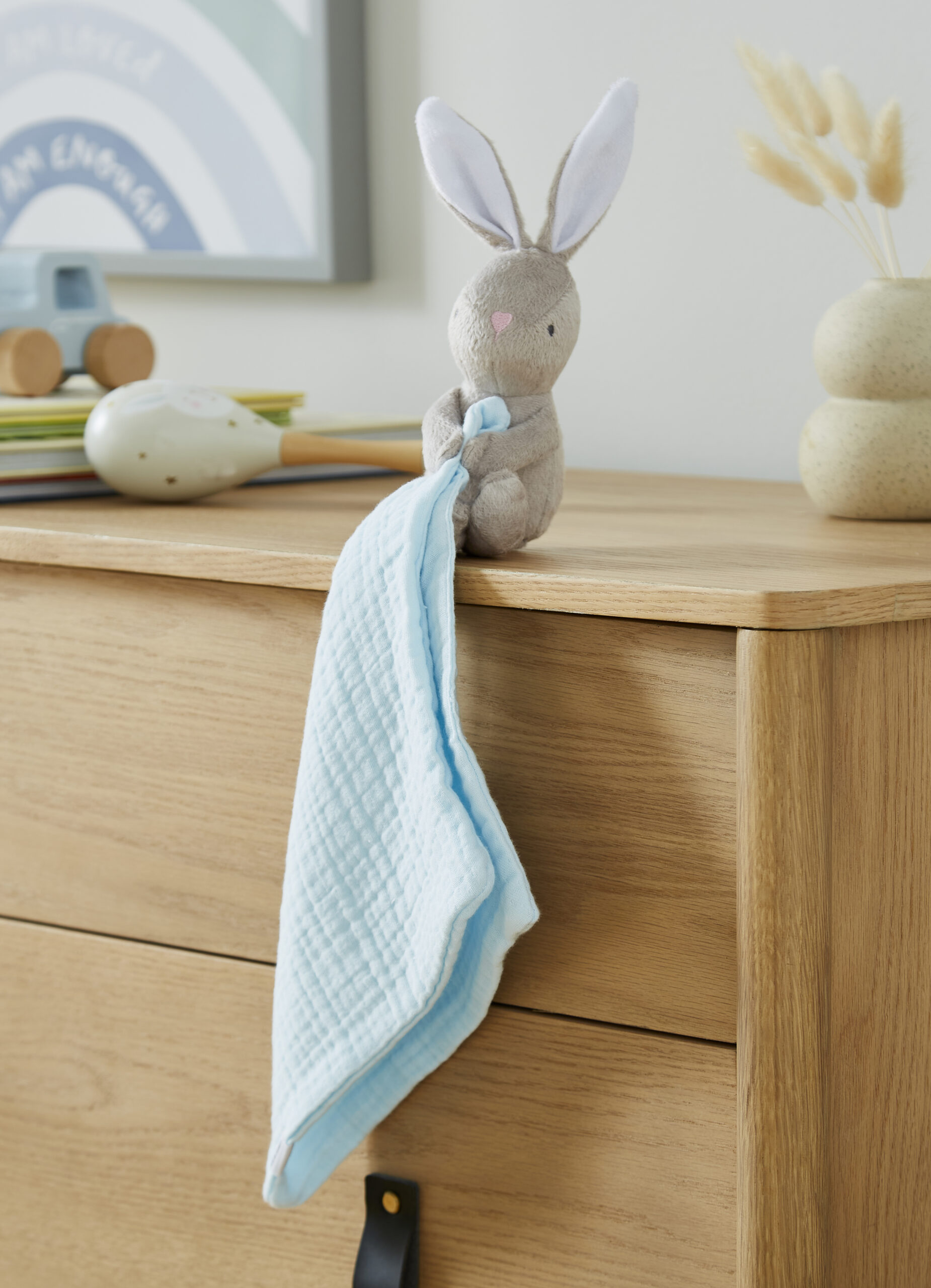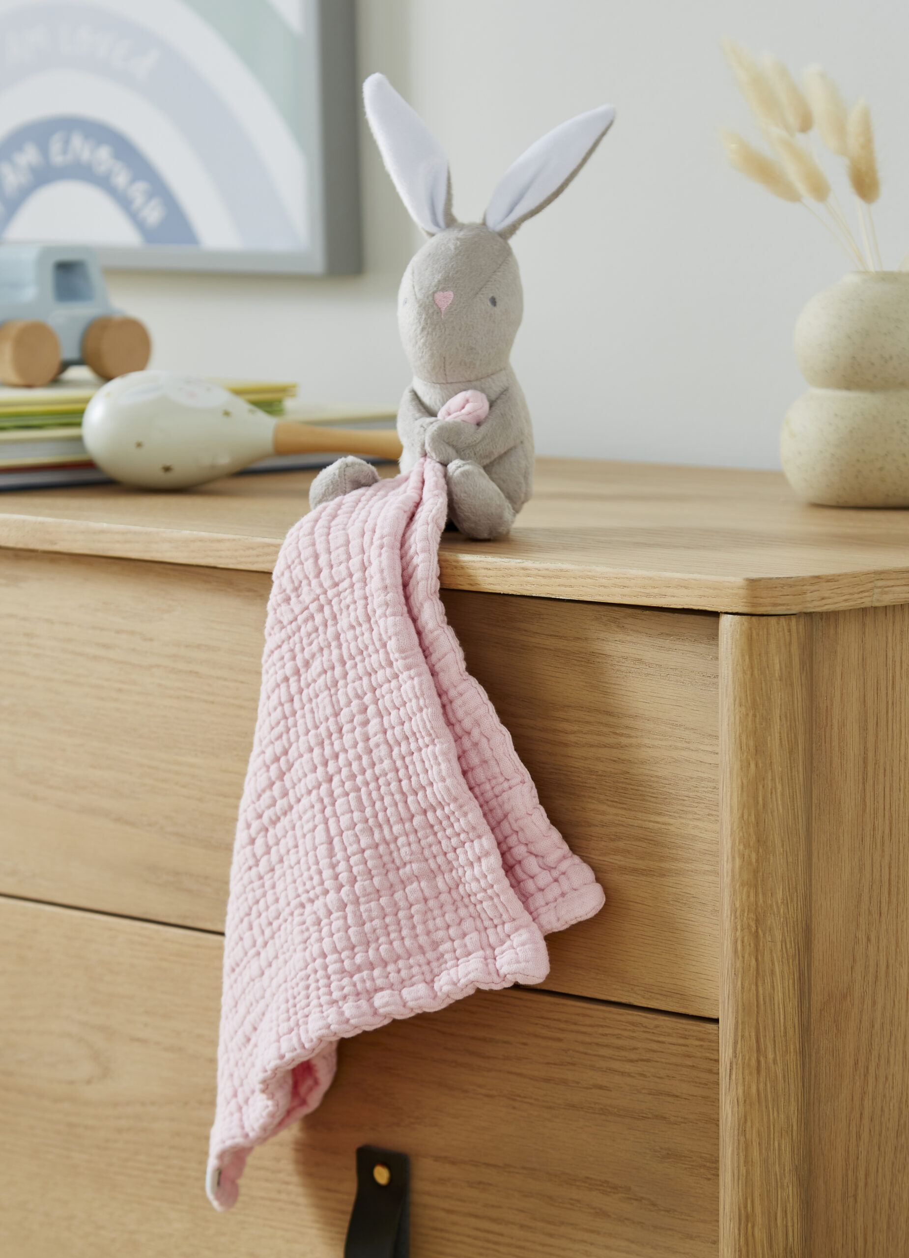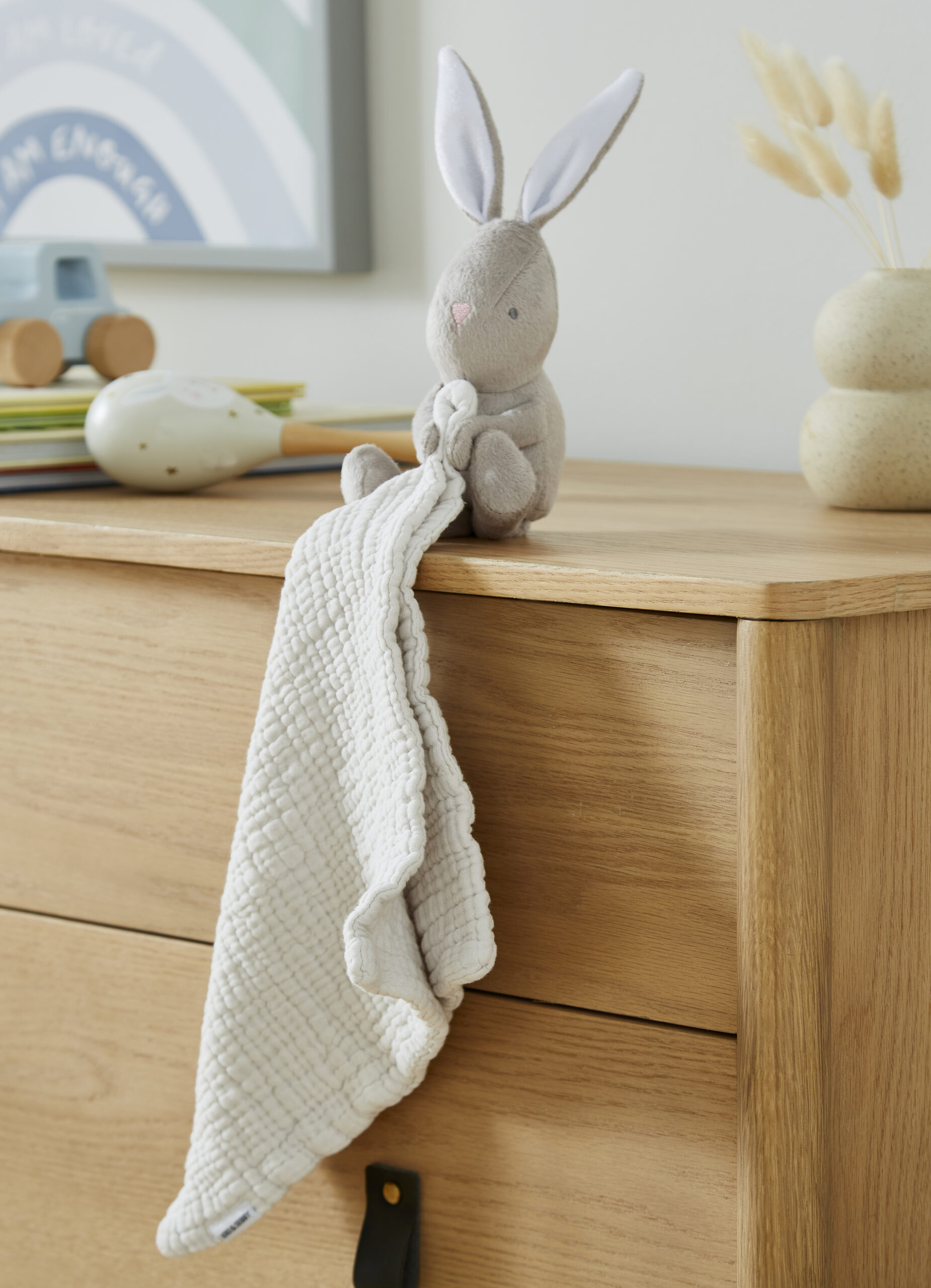 The HOP HOP Bunny comforter serves multiple purposes, from dribble and cuddle time to soothing teething babies. We prioritize your baby’s comfort and have carefully selected Extra-Long Staple (ELS) cotton because it is the softest and highest quality cotton available. With each wash, the fabric becomes even softer, providing long-lasting comfort.
